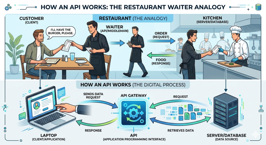 Think of an API like a waiter in a restaurant. You (the user) sit at the table with a menu. The kitchen (the database) has the food. You cannot go into the kitchen yourself to get the ingredients. Instead, you give your order to the waiter (the API), who takes it to the kitchen and brings your prepared food back to the table.