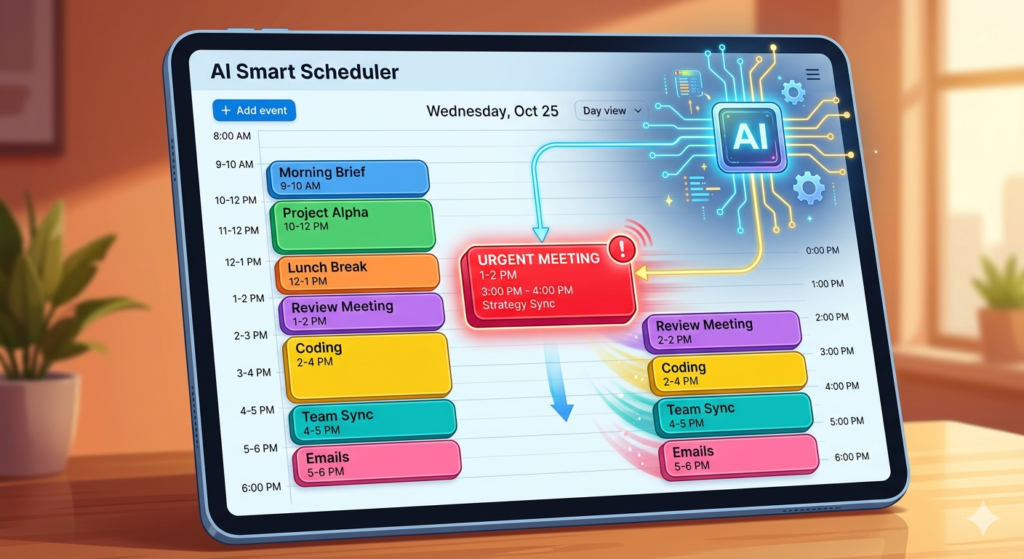 Demonstration of an AI schedule maker automatically shuffling tasks to accommodate an urgent event.